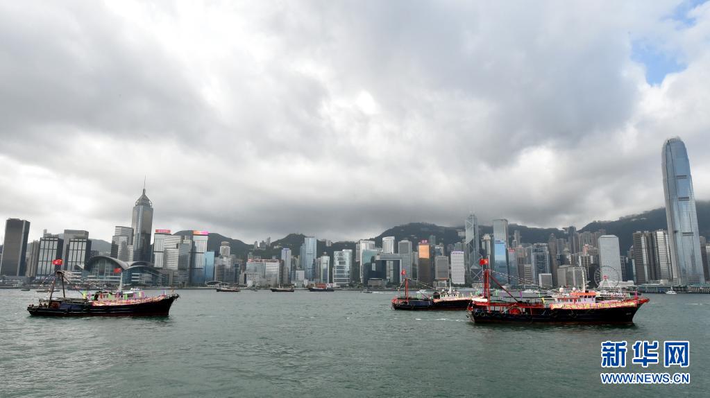 7月1日,悬挂国旗、区旗的渔船在维港巡游。新华社记者 卢炳辉 摄