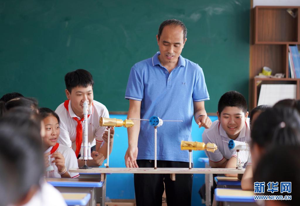 7月2日,在河北省邢台市内丘县新西关小学,科技辅导员李连国老师为学生普及航天知识。