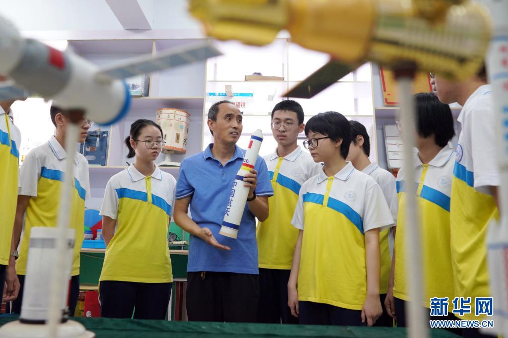 7月2日,在河北省邢台市内丘县第二中学,科技辅导员李连国老师为学生普及航天知识。