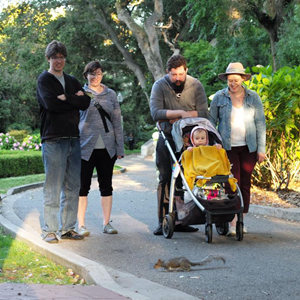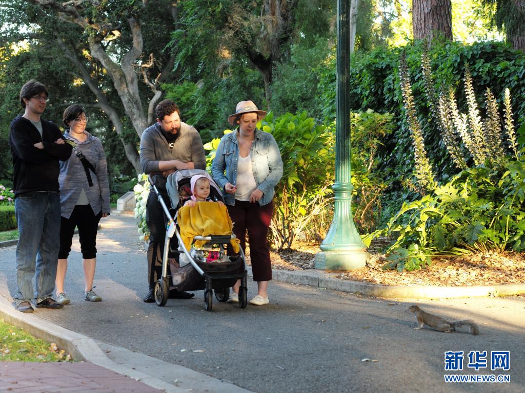 7月1日,在美国旧金山湾区城市圣马特奥,在公园休闲的人们注视着一只路上的松鼠。