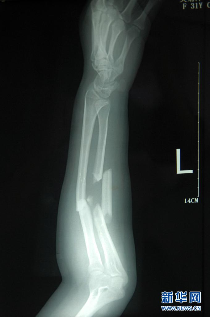 这是2011年7月3日拍摄的吴菊萍受伤左臂的X光片,医生诊断为手臂左尺桡骨多段粉碎性骨折。新华社记者 黄宗治 摄