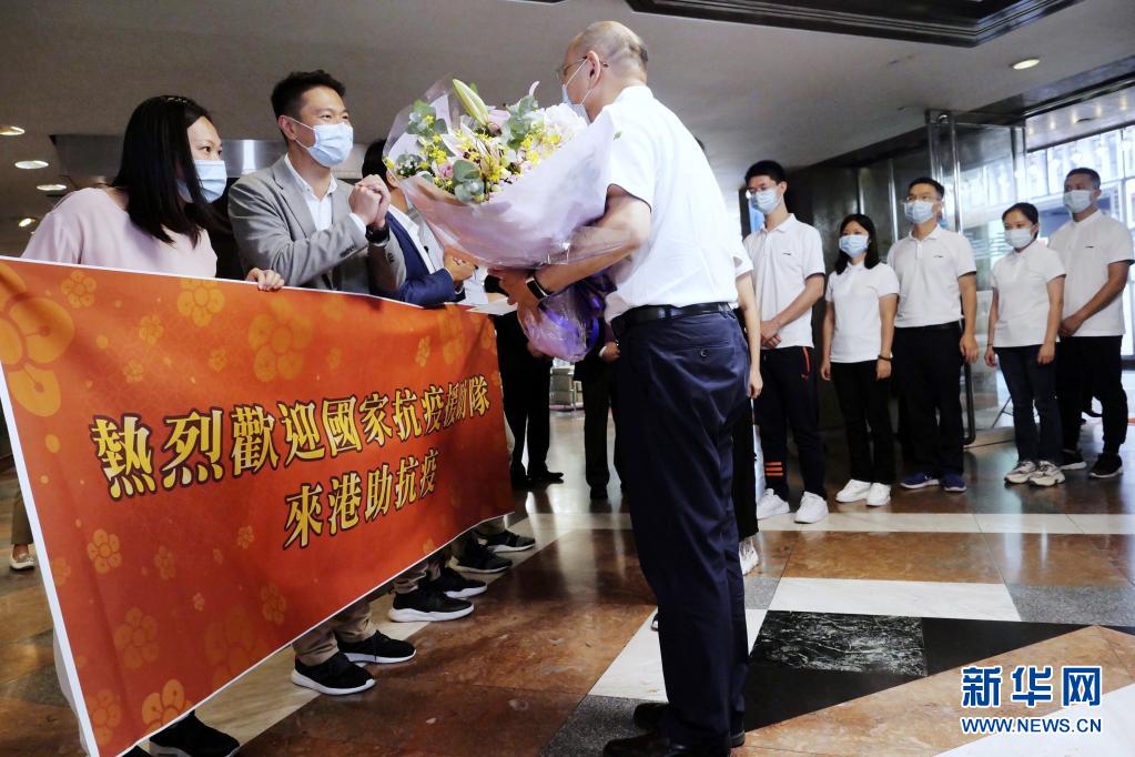 香港市民代表在香港九龙维景酒店欢迎内地核酸检测支援队抵港(2020年8月21日摄)。
