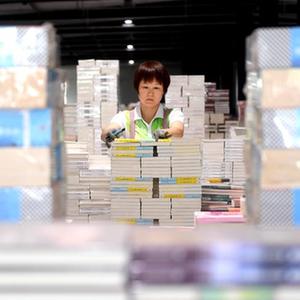 7月2日,在永清县三圣口乡一家图书文化企业仓储中心,工作人员在整理图书。