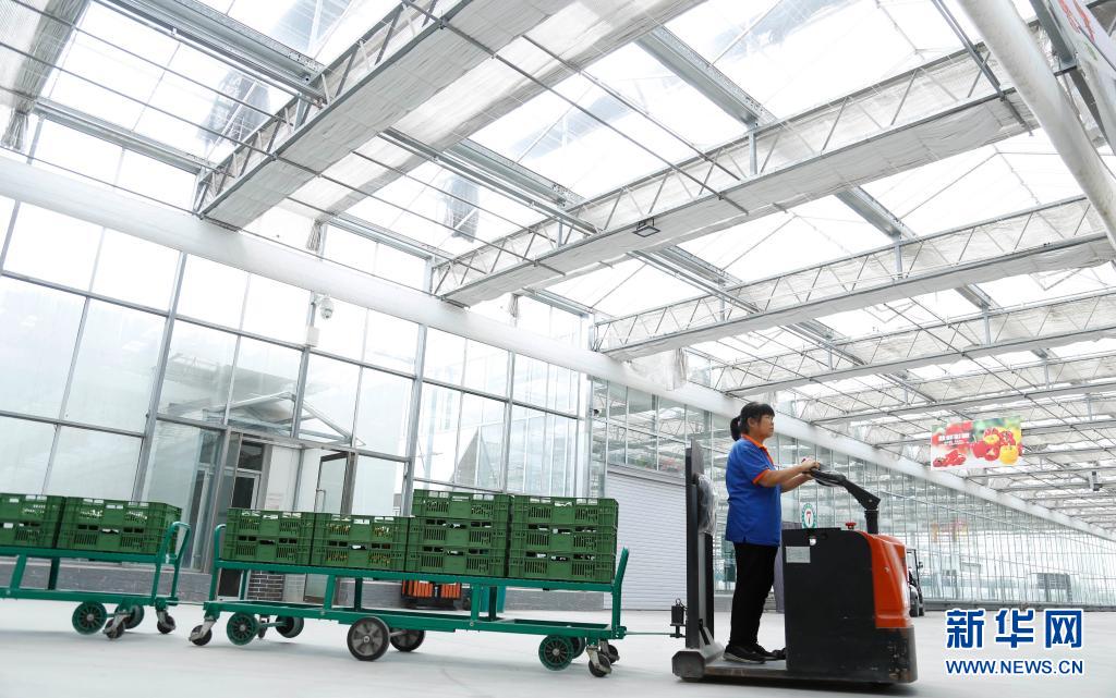 7月3日,在邢台市南和区贾宋镇一家现代农业园区,工人在运输蔬菜。