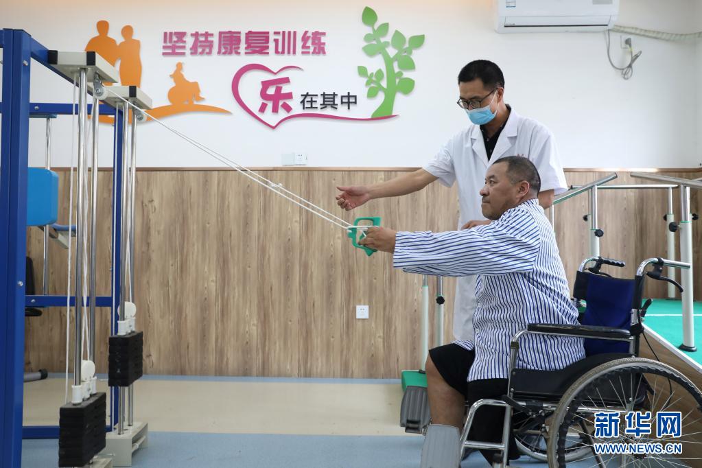 7月3日,在温县祥云镇医养中心,入住人员在医生指导下进行康复锻炼。