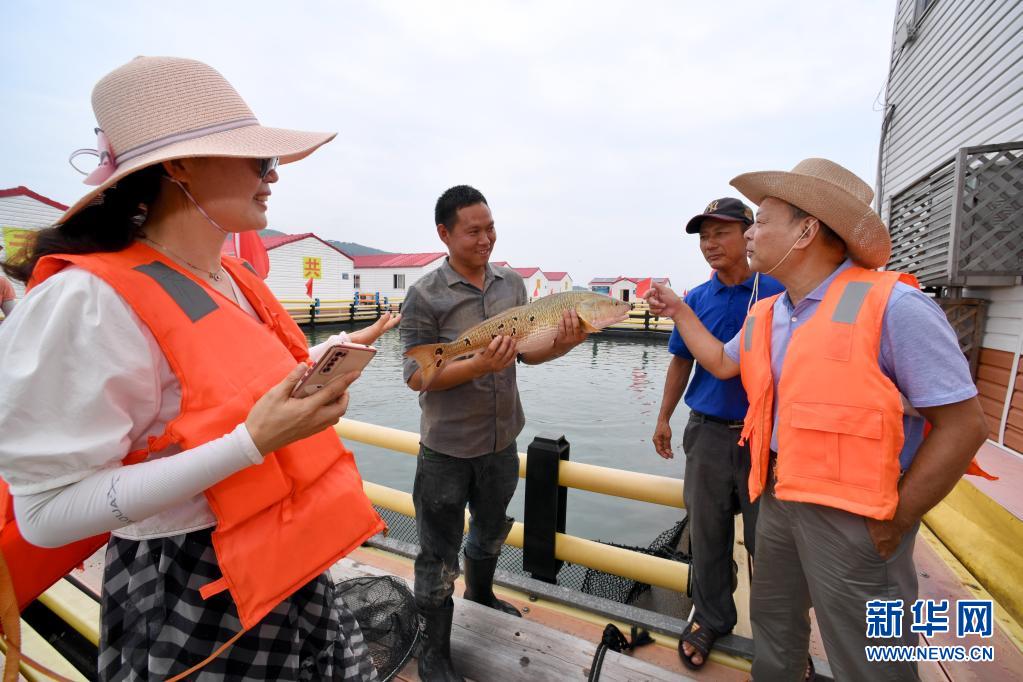 7月1日,在霞浦县溪南镇七星海域深水网箱养殖区,养殖户(左二)在向游客展示饲养的海鱼。