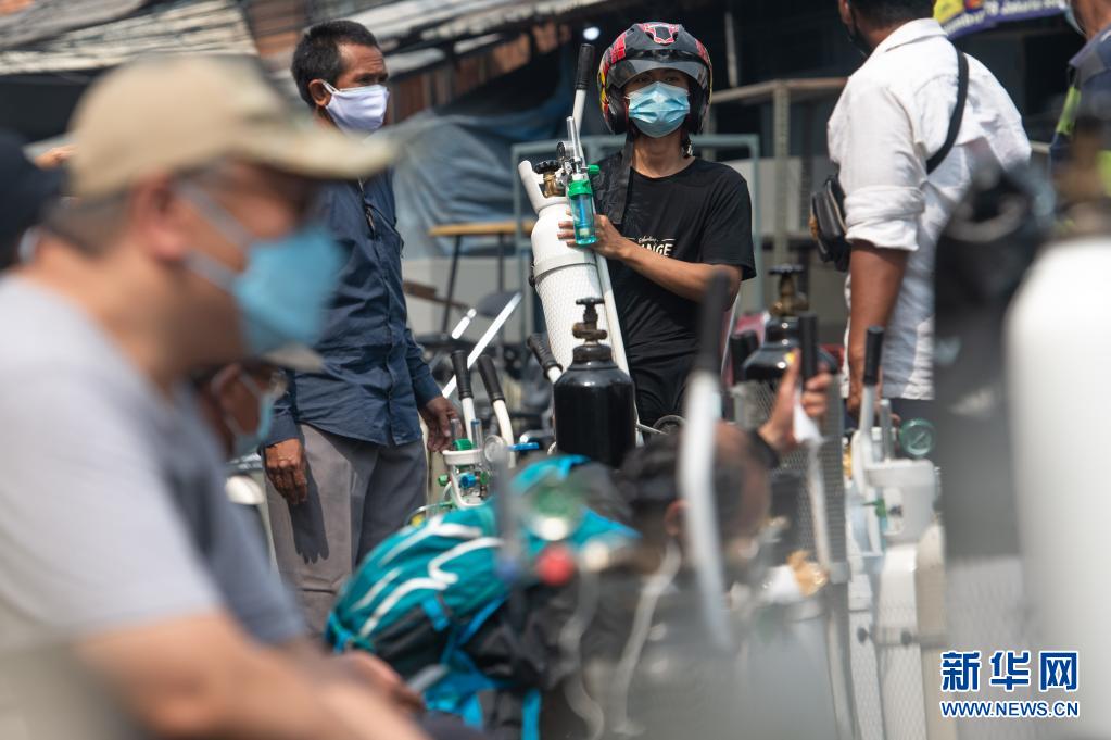7月5日,人们在印度尼西亚雅加达排队给氧气罐充氧。