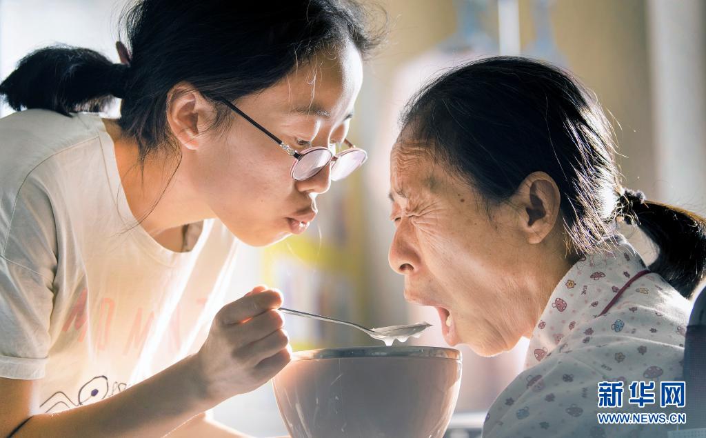 杨竹梅(左)耐心地哄母亲进食(6月22日摄)。每一次喂饭都要持续一个多小时。