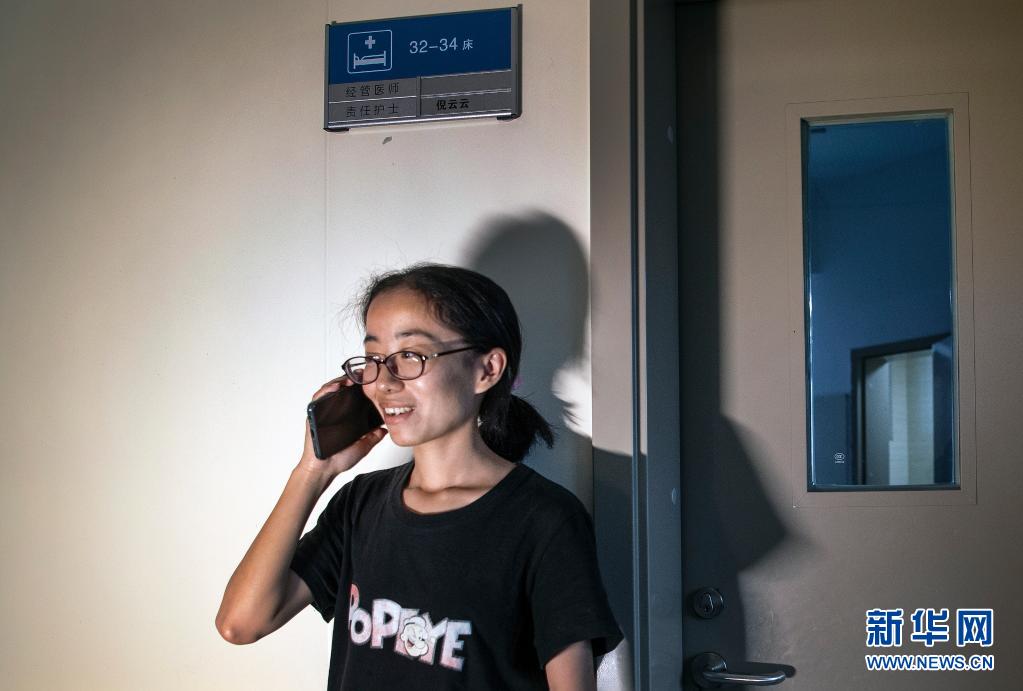 杨竹梅在接听学校老师询问她生活和学习情况的电话(6月23日摄)。新华社记者 陶明 摄