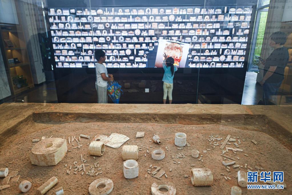 2020年6月6日,小游客在浙江省杭州市余杭区瓶窑老街的“良渚玉雕馆”内通过电子屏学习玉雕知识。