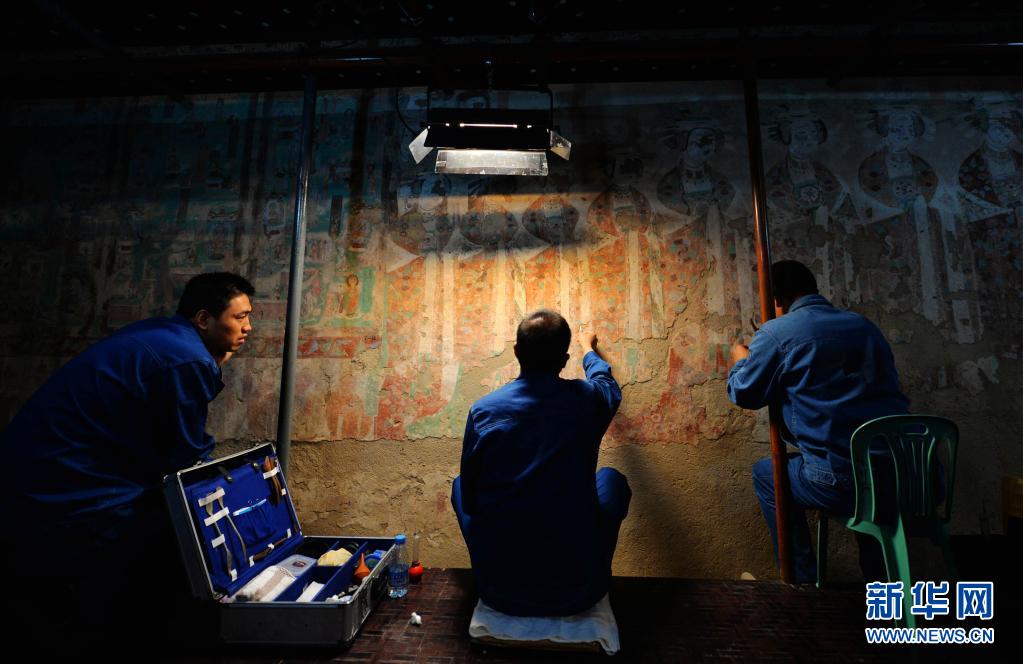 敦煌研究院技术人员在莫高窟98窟内对病害壁画进行修复(2014年9月3日摄)。
