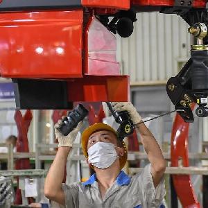 工人在位于长春的一汽解放总装车间装配车辆(7月7日摄)。