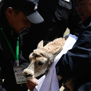 7月7日,在可可西里索南达杰保护站野生动物救助中心,可可西里巡山队员按照风俗,在藏羚羊额头上涂抹酥油表达祝福。新华社记者 张龙 摄