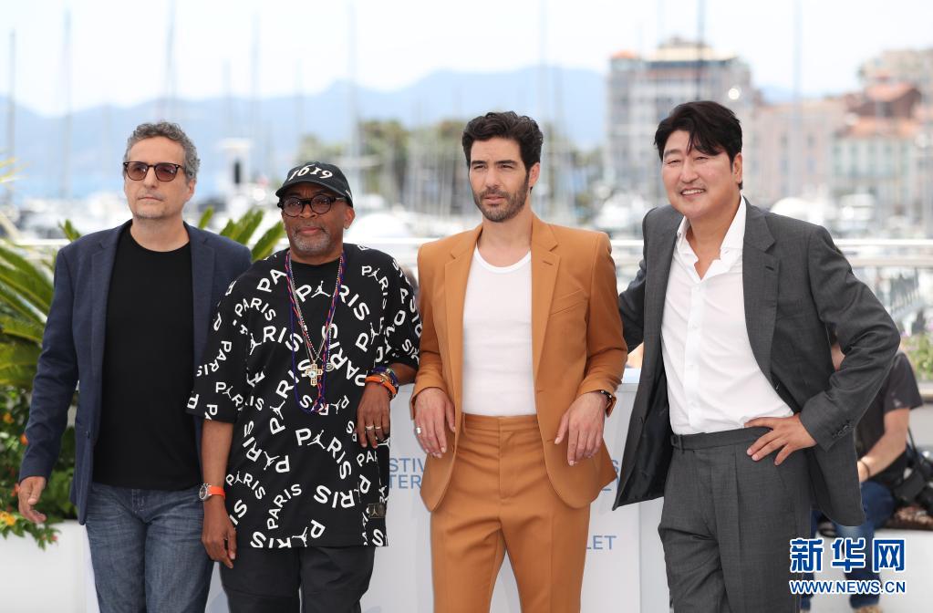 7月6日,第74届法国戛纳国际电影节主竞赛单元评委出席拍照式。从左至右:小克莱伯·门多萨、斯派克·李、塔赫尔·拉希姆、宋康昊。
