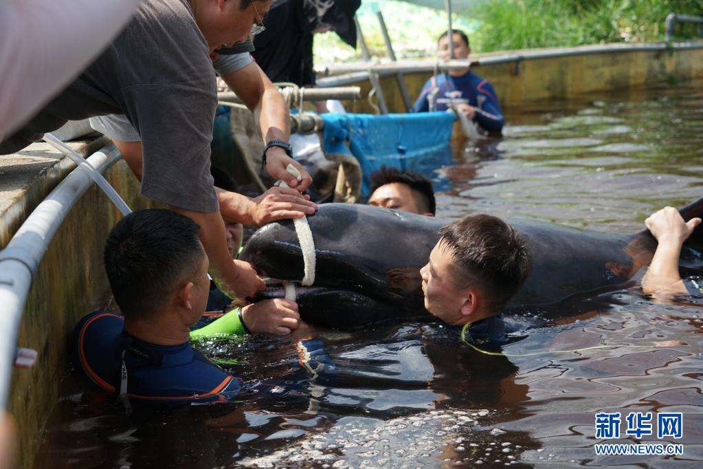 7月7日,工作人员通过插胃管的方式为瓜头鲸补液。新华社记者 林光耀 摄