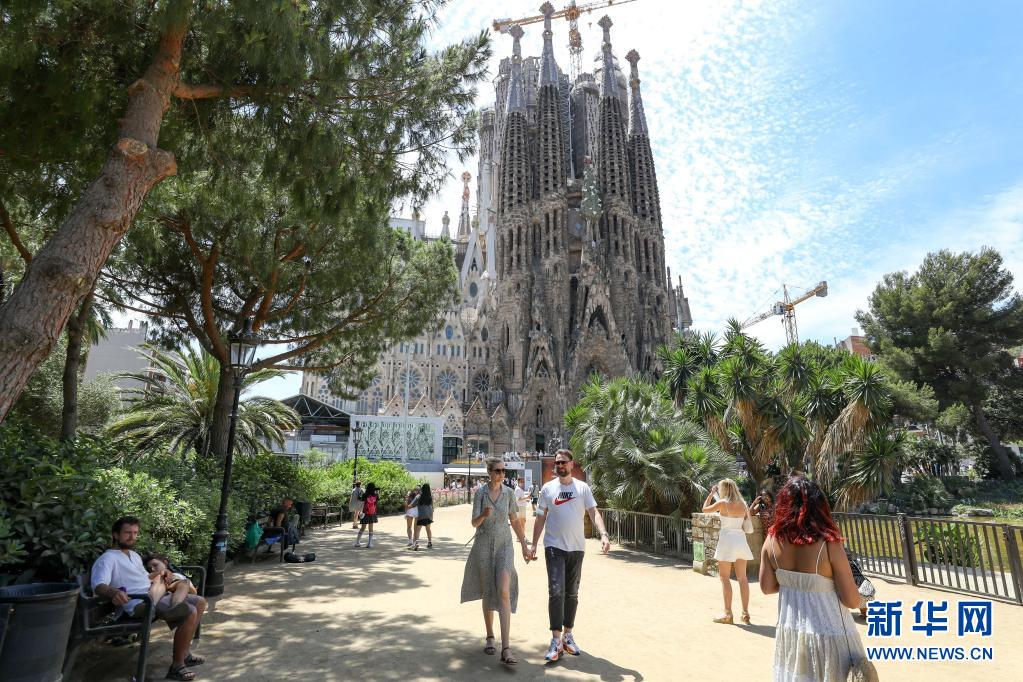 游客在西班牙巴塞罗那圣家堂附近游览(6月27日摄)。