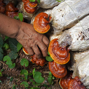 7月8日,在江西广昌县旴江镇旴江生态公益林场食用菌种植基地,农民在采摘林下种植的灵芝。