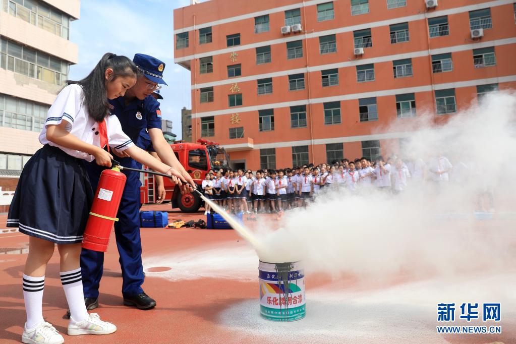 7月7日,在淮北市第三实验小学,消防救援人员指导学生使用灭火器。