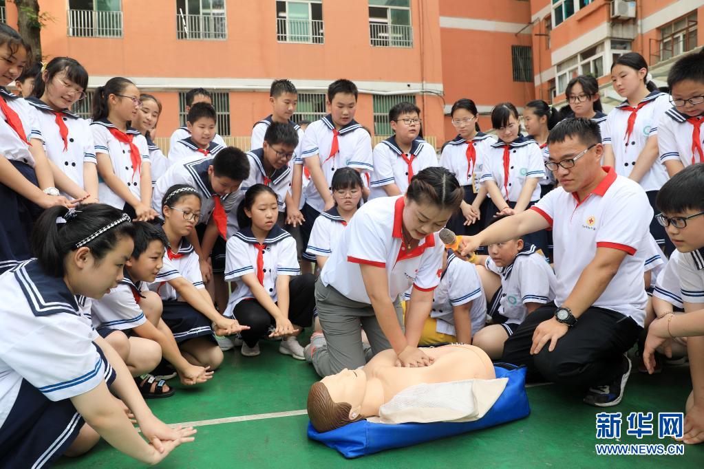 7月7日,淮北市红十字救援队的队员为学生们演示心肺复苏急救操作。新华社发(万善朝 摄)