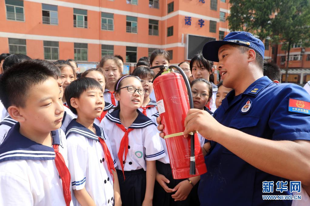 7月7日,在淮北市第三实验小学,消防救援人员为学生们讲解灭火器使用方法。新华社发(万善朝 摄)
