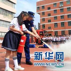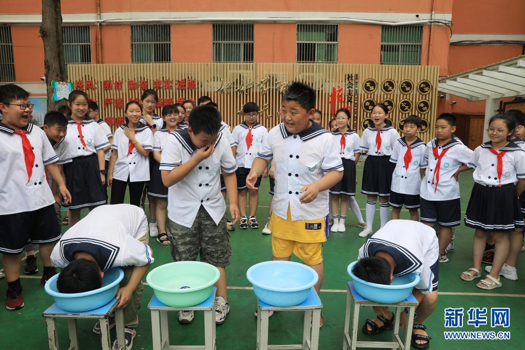 7月7日,淮北市第三实小学的学生在进行水中闭气防溺水体验。新华社发(万善朝 摄)