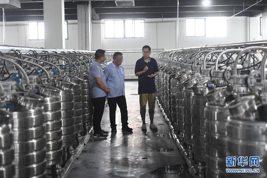 在句容市天王镇戴庄村,赵亚夫(中)在食品加工企业了解戴庄农产品深加工情况(7月6日摄)。 新华社记者 季春鹏 摄