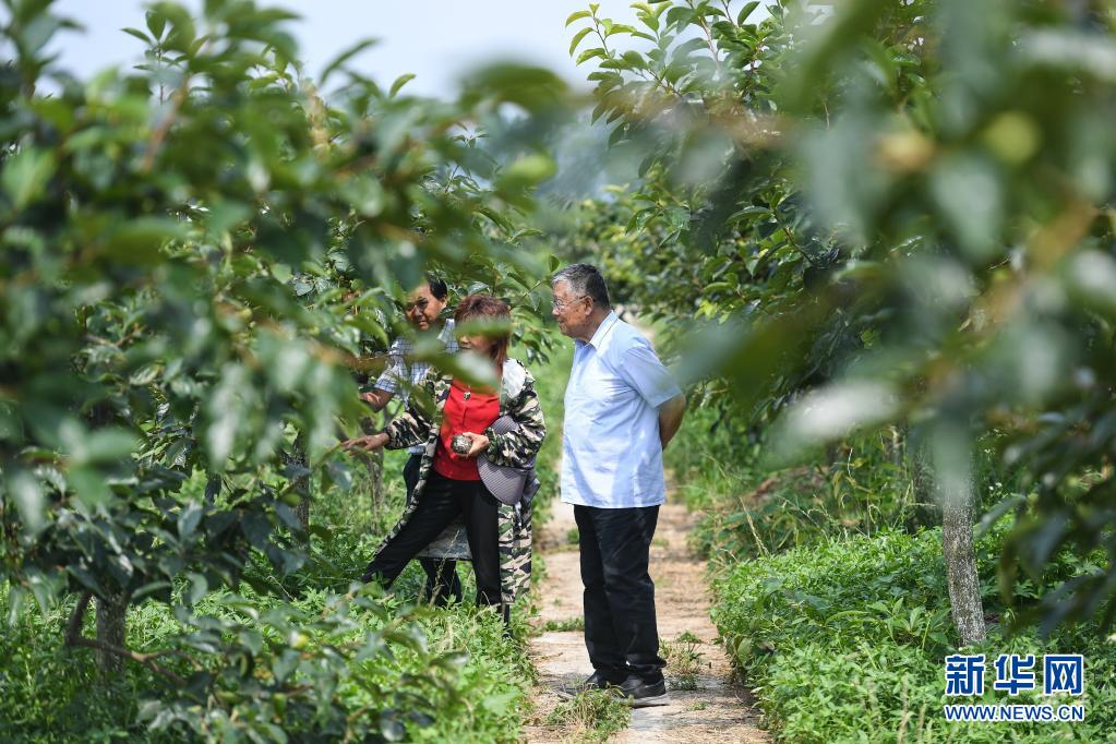 在句容市天王镇戴庄村,赵亚夫(右)在一处家庭农场查看果树长势(7月6日摄)。 新华社记者 季春鹏 摄