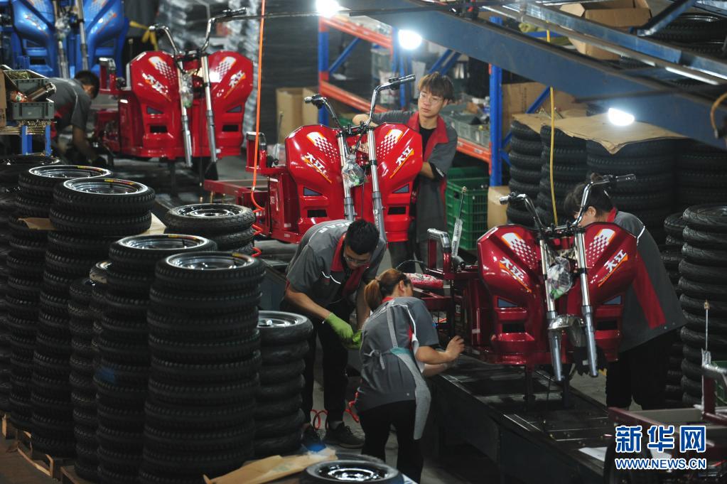 7月8日,工人在任丘市一家电动三轮摩托车生产企业组装车间工作。