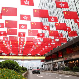 6月29日,在香港尖沙咀一条街上,中华人民共和国国旗和香港特别行政区区旗一起迎风飘扬。新华社记者 李钢 摄