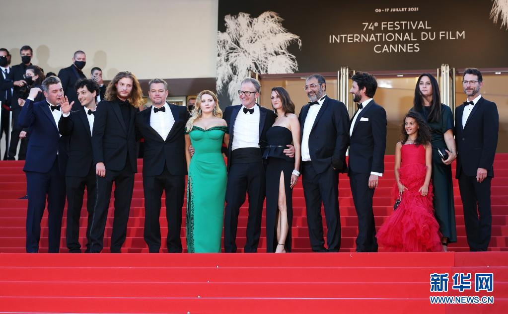 7月8日,在法国戛纳,导演汤姆·麦卡锡(左六)、演员马特·达蒙(左四)等主创人员亮相非竞赛单元影片《止水》的首映式红毯。