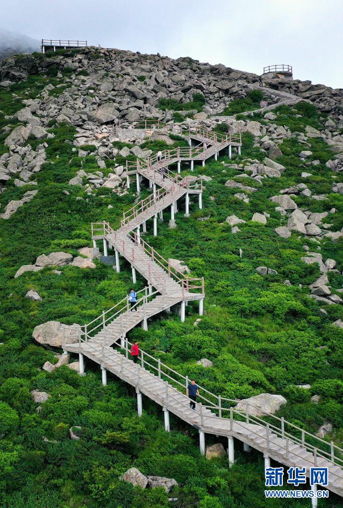 7月8日,游人在陕西朱雀国家森林公园内游览(无人机照片)。公园内的大面积石海,是典型的冰川侵蚀地貌,也是秦岭地区冰川遗迹的代表。