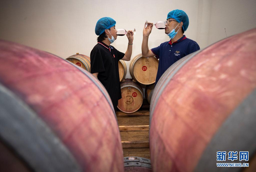 在位于宁夏贺兰山东麓的一酒庄的橡木桶陈酿区,酒庄工作人员(右)和宁夏大学食品与葡萄酒学院葡萄系的学生一同品尝葡萄酒(7月8日摄)。新华社记者 杨植森 摄