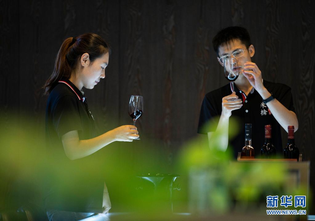 在位于宁夏贺兰山东麓的一酒庄的品酒室,酒庄工作人员(右)向宁夏大学食品与葡萄酒学院葡萄系的学生展示葡萄酒产品(7月8日摄)。新华社记者 杨植森 摄