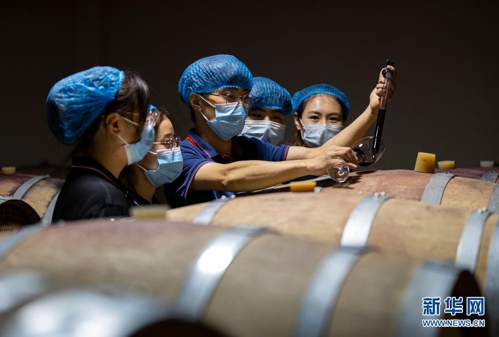 在位于宁夏贺兰山东麓的一酒庄的橡木桶陈酿区,酒庄工作人员(左三)在向宁夏大学食品与葡萄酒学院葡萄系的学生演示葡萄酒橡木桶取样过程(7月8日摄)。新华社记者 杨植森 摄