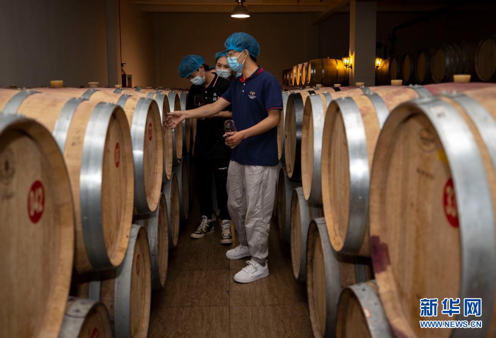在位于宁夏贺兰山东麓的一酒庄的橡木桶陈酿区,酒庄工作人员(前)在向宁夏大学食品与葡萄酒学院葡萄系的学生展示陈酿所用橡木桶(7月8日摄)。新华社记者 杨植森 摄
