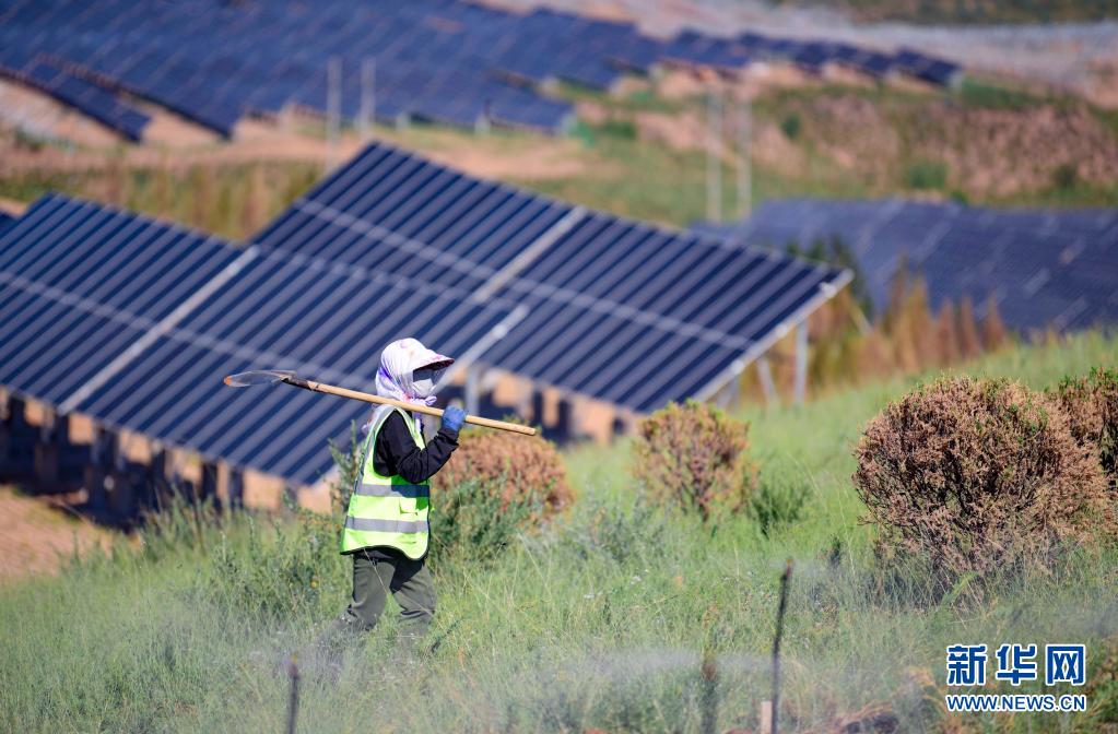 7月8日,工作人员在伊金霍洛旗天骄绿能50万千瓦采煤沉陷区生态治理光伏发电示范项目区里进行绿化作业。