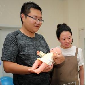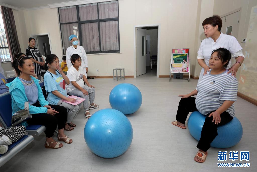 7月9日,在全椒县人民医院孕妇学校,医生指导“准妈妈”学习孕妇瑜伽。