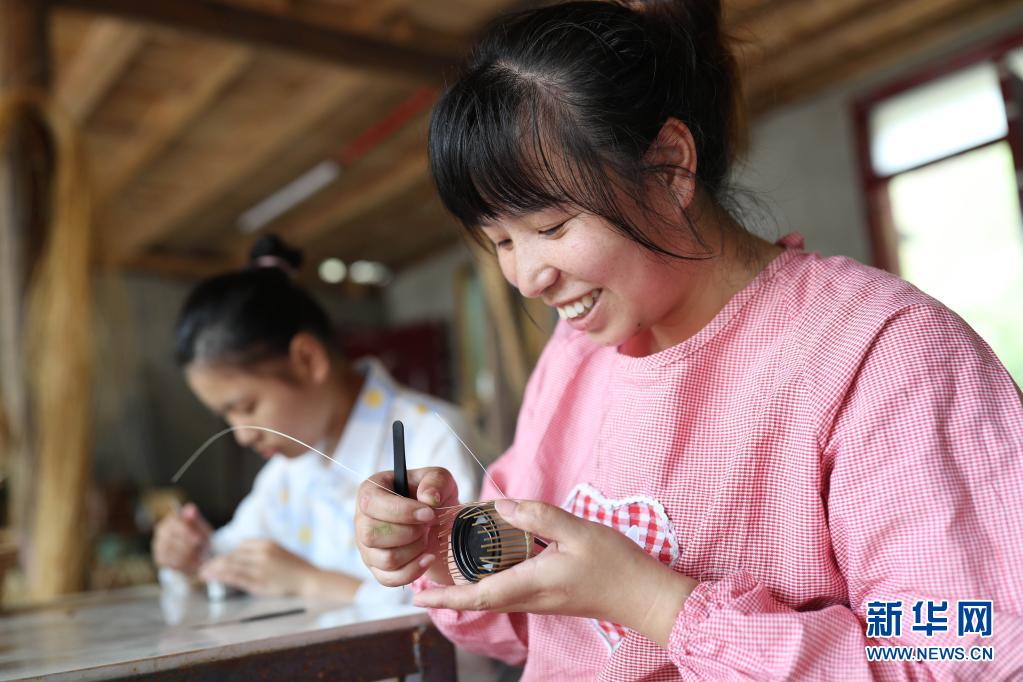 7月9日,杨杜娟(右)在三穗县八弓镇界牌村制作竹编产品。