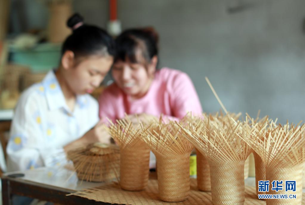 7月9日,杨杜娟(右)在三穗县八弓镇界牌村指导员工制作竹编产品。