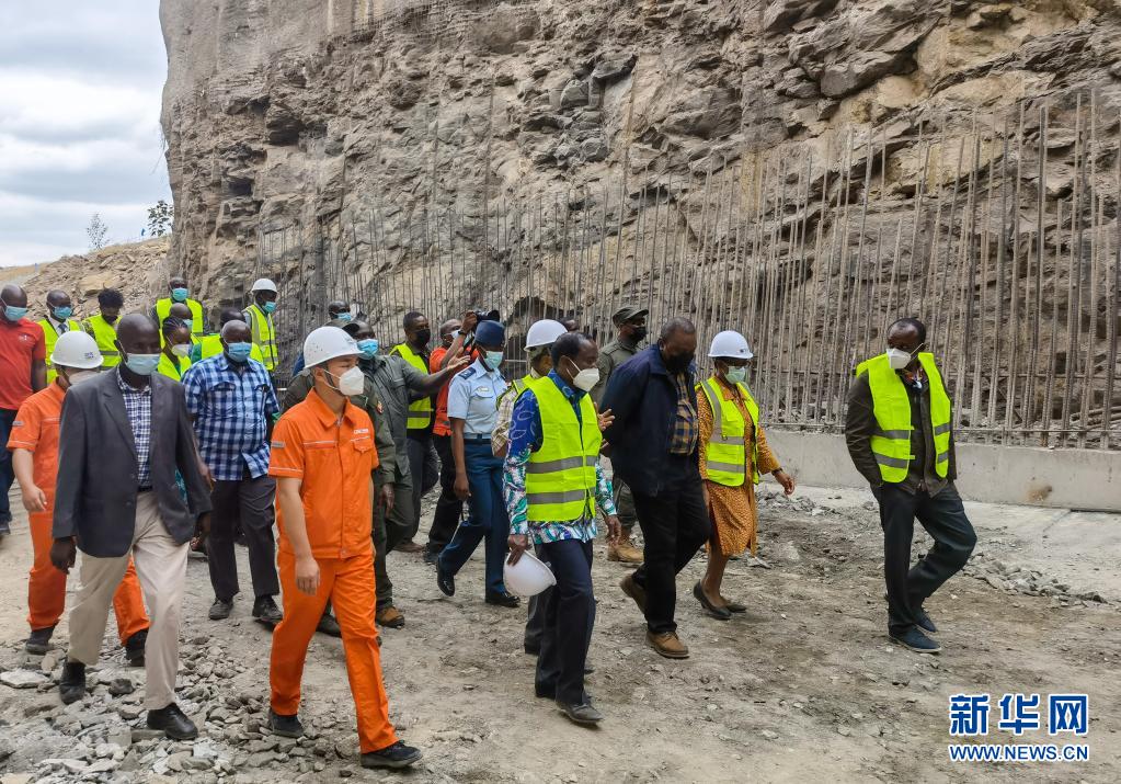 7月9日,肯尼亚总统肯雅塔(右三)在肯尼亚西南部的斯瓦克大坝项目现场视察。