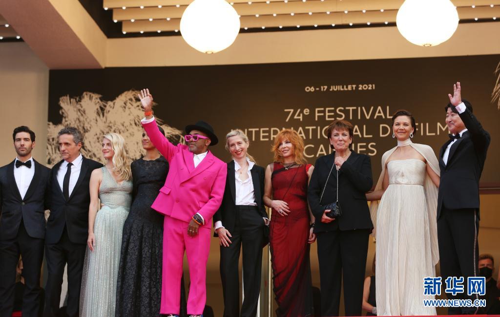 7月6日,第74届法国戛纳国际电影节主竞赛单元评委会主席、美国导演和制片人斯派克·李(左五)携主竞赛单元评委出席开幕式红毯。