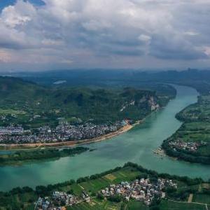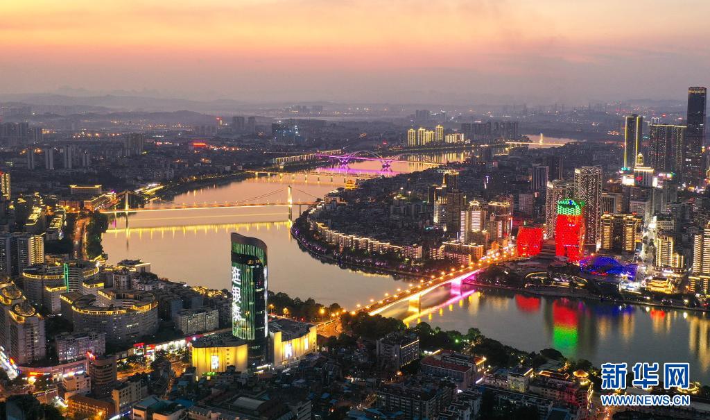 夕阳下的柳江柳州市区河段(6月7日摄,无人机照片)。
