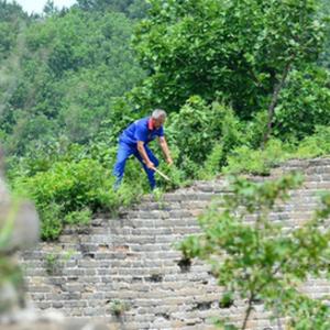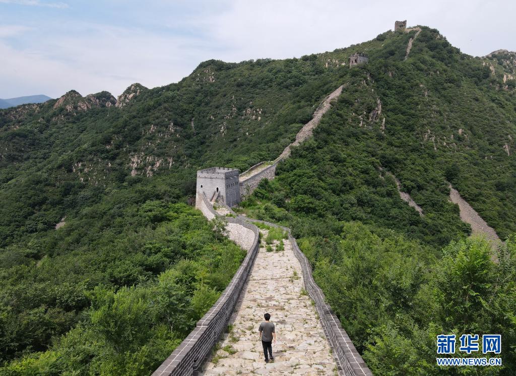 7月8日,在秦皇岛市海港区的板厂峪长城,李翠进行巡护工作(无人机照片)。新华社记者 金皓原 摄
