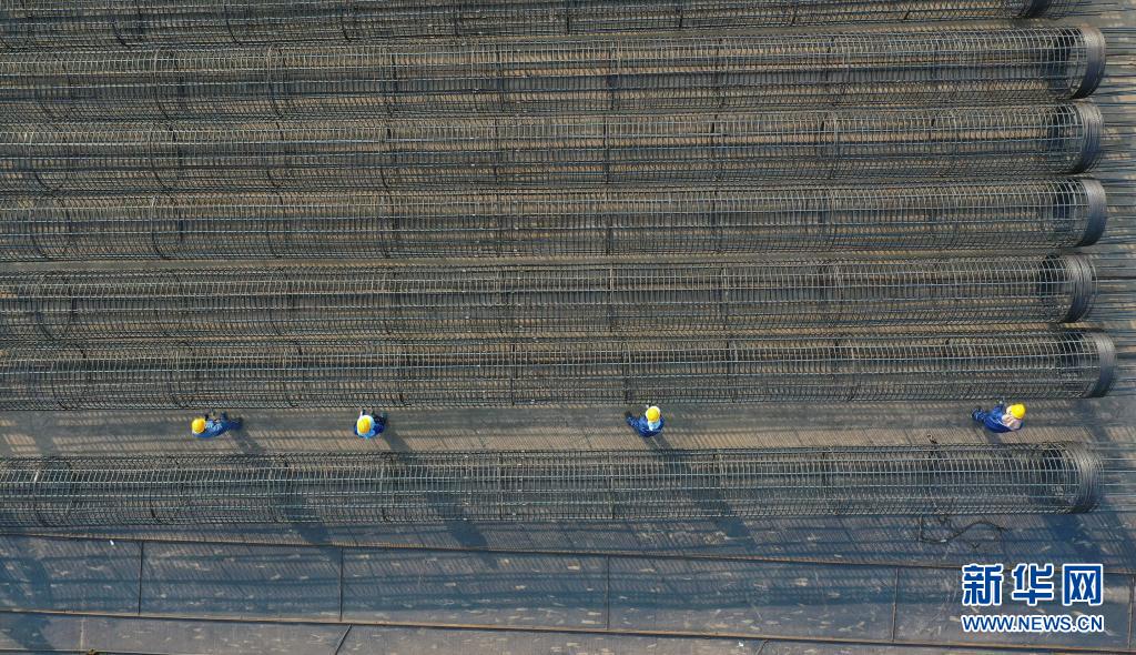 7月10日,工人在新天LNG(液化天然气)项目二期工程建设工地施工(无人机照片)。