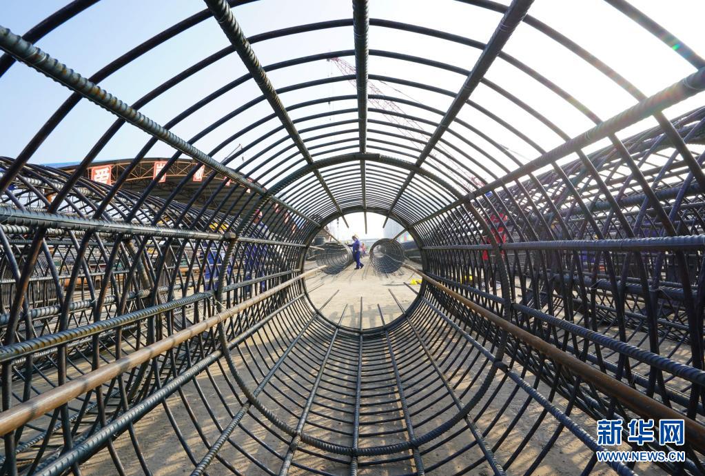 7月10日,工人在新天LNG(液化天然气)项目二期工程建设工地施工。