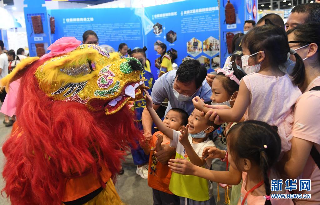 7月10日,在南宁国际会展中心,来自广西百色市田阳区头塘镇中心小学的学生在舞狮表演中与观众互动。