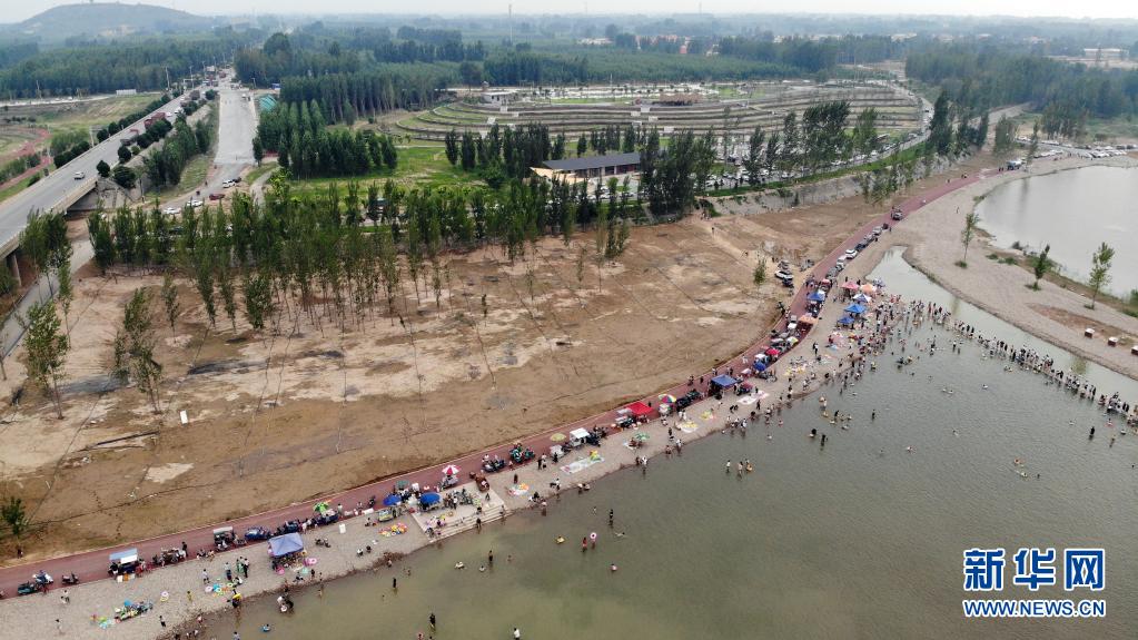 市民在石家庄滹沱河生态修复三期工程鹿泉段白虹飞鹭生态区游玩(7月10日摄,无人机照片)。