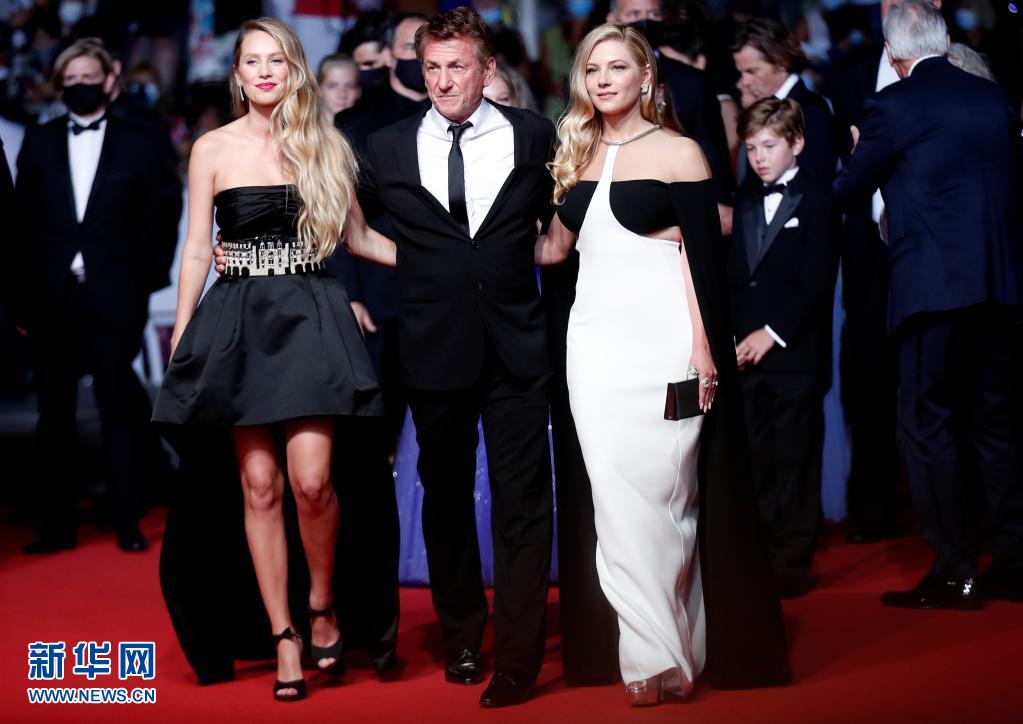 7月10日,在法国戛纳,美国导演肖恩·潘(中)携主创人员亮相美国影片《国旗日》的首映式红毯。