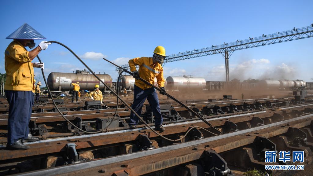 在柳州南编组站,柳州电务段缓行器工区的信号工对驼峰缓行器设备进行集中维护(7月9日摄)。新华社记者 张爱林 摄