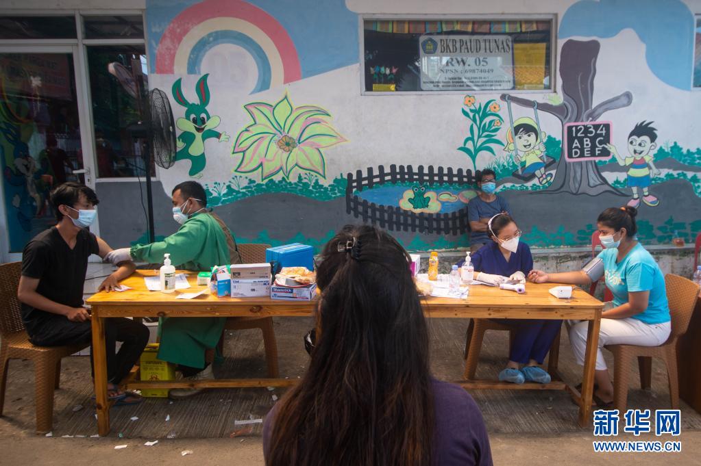 7月12日,医务人员在印度尼西亚雅加达一处人口密集区的移动疫苗接种点为居民接种新冠疫苗。